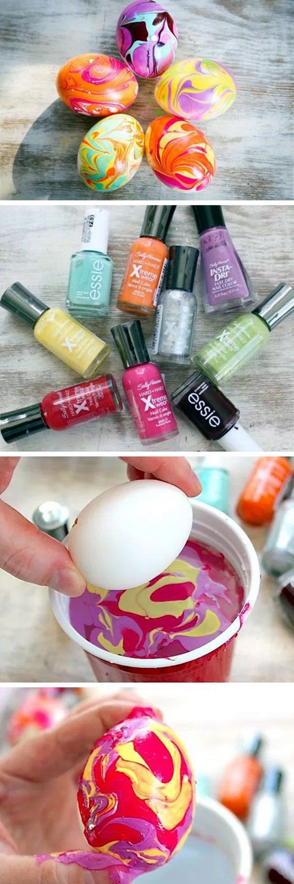 It is another very easy decorative idea, where you can spray the acrylic paints on the egg shells with the help of an old tooth brush. Different colors can be used to make it more attractive and colorful.