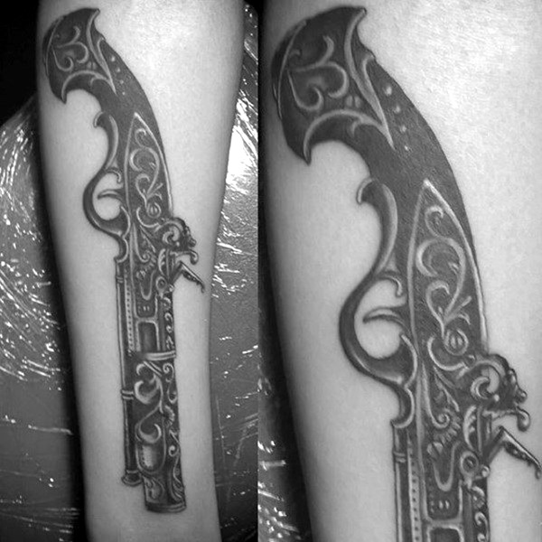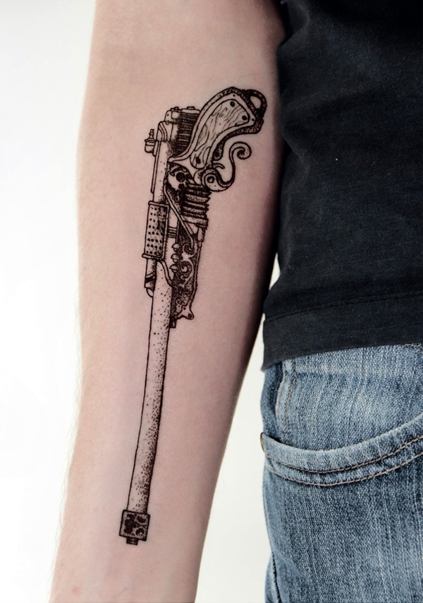 This tattoo is sure to have every man’s attention. This antique gun forearm tattoo is ultra macho with a clear retro era inspired theme. If you have been a cowboy movie fan for ages, this is clearly your best chance to take your love for the old school of art to one step further.