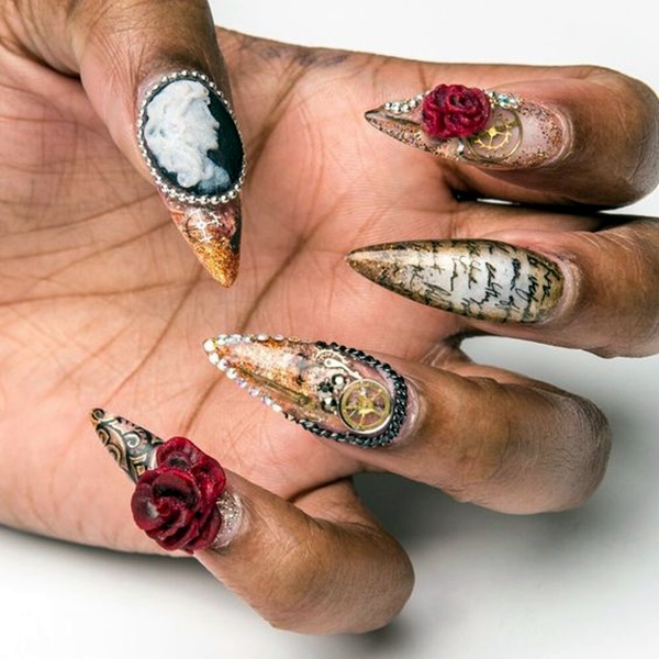 Want to give spectacular look to your nails with rose nail designs? Why don’t you opt for artistic rose nail design? You need to draw pink roses on blue background to create a wonderful effect and to express your cool nature. Even, the yellow rose nail design is also a good choice for college going girls. To achieve this cute and neat look, paint red roses on a yellow background.