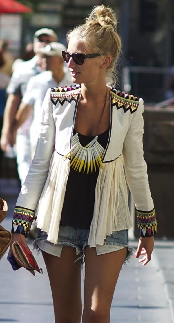 How about trying out a bohemian jacket three quarter sleeve this time with sexy simple but authentic tee with leggings? Slouchy shoes will look incredible on this going-to-be bohemian girl. Wear earrings to add up dramatic statement to the fashion this week and a sexy broad metallic bracelet to show off your amazing three quarter jacket.