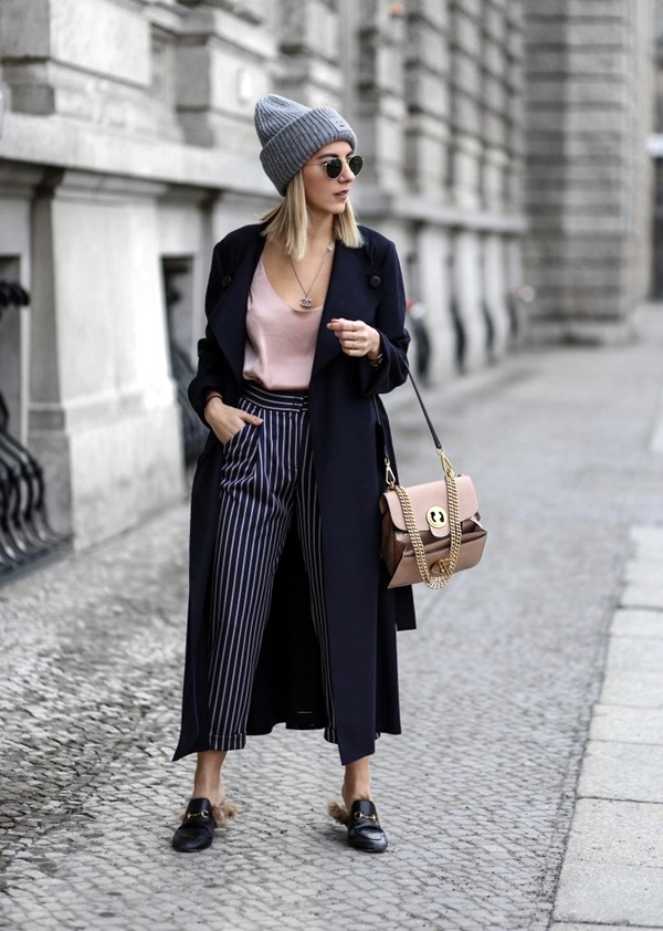 Are you worried about stripes making you look ‘wide?’ Don’t be tensed, but if you’re, go for this outfit style. The striped ankle-length trousers look perfect with glossy leather loafers, dark blue wool coat worn over pastel-blue shirt.