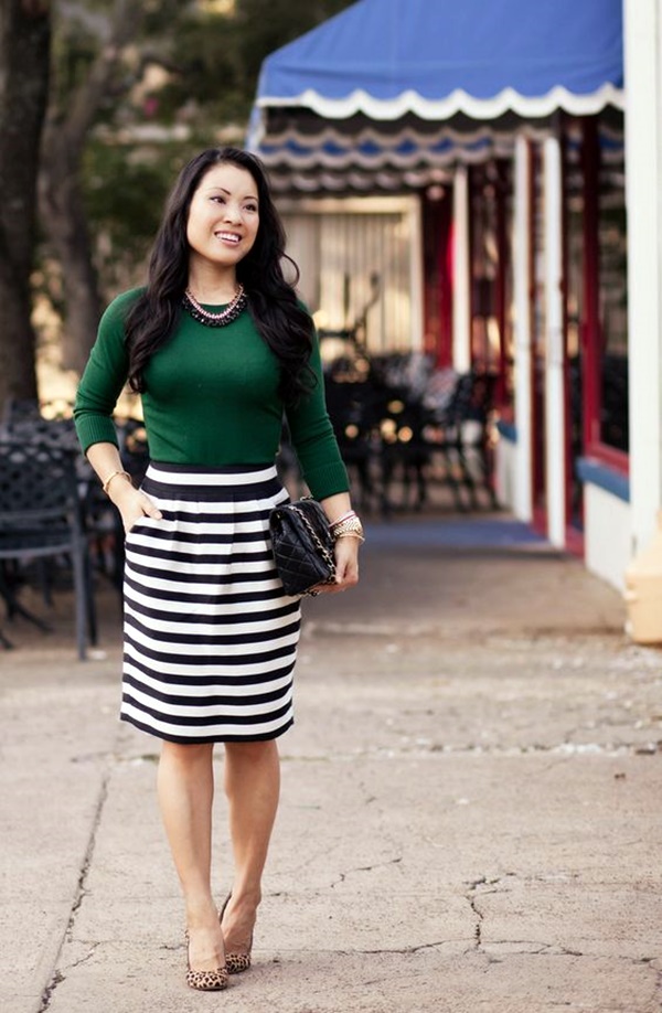 Beautiful Gals! It’s becomes easy for you to achieve a more feminine and polished look while wearing striped skirts, even though they are super-edgy. Pairing black-white striped skirt with a preppy pink long-sleeved tee seems to be top stylish ways to wear striped outfits in 2017. Balance the look by adding pointed toe-pumps.