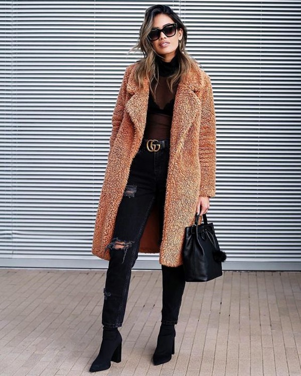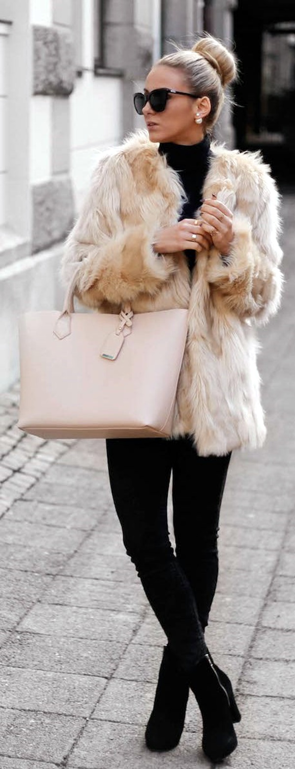 Do you want to look different this fall? Simplicity is the key! Try to style your big fur coat with ribbed black tight jeans and combat boots. Go Bold and complete the look by adding rounded sunglasses and light brown leather side bag. You will look stunning…seriously!