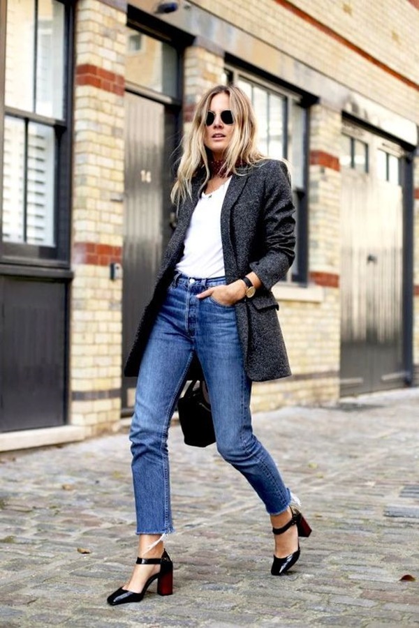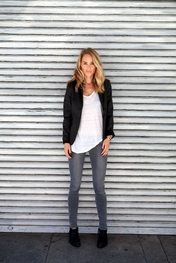 Proper Business casual style is here! Go for a tailored grey wool blazer worn with white tee and light grey fitted jeans tucked in multi-buckled pointed-toe leather boots. Add a jacket for layers feel so and keep the jewelry to minimum.